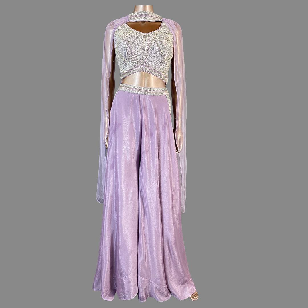 A festive and decadent set in Georgette, just in time for the season of celebrations. Its luxurious form is highlighted by the glistening details of zardozi and sequin embroidery.