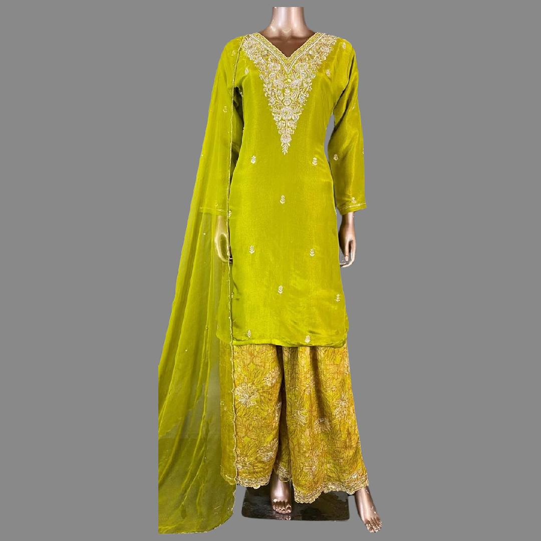 A festive and decadent set in Georgette, just in time for the season of celebrations. Its luxurious form is highlighted by the glistening details of zardozi and sequin embroidery.