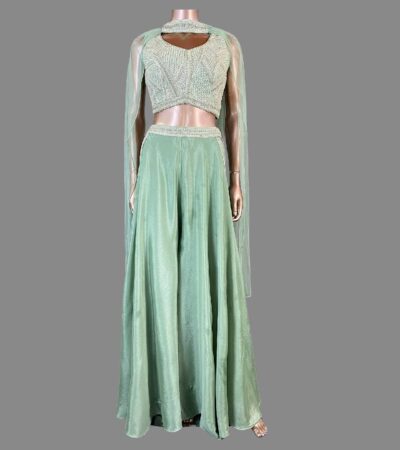 A festive and decadent set in Georgette, just in time for the season of celebrations. Its luxurious form is highlighted by the glistening details of zardozi and sequin embroidery.