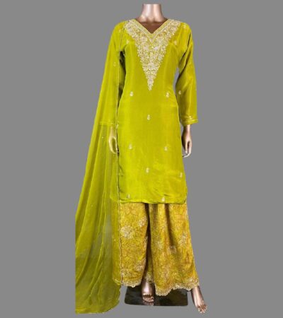 Designer Lucknowi Chinon Suit – Bright Green