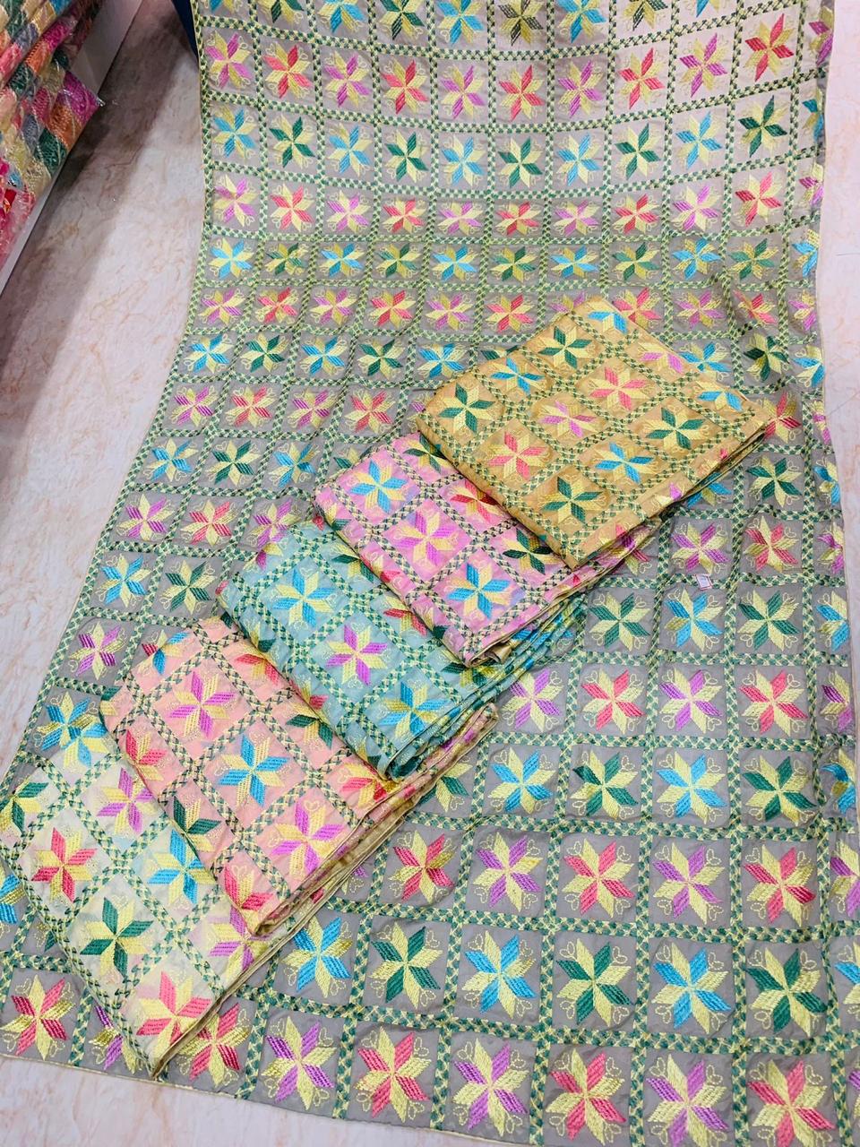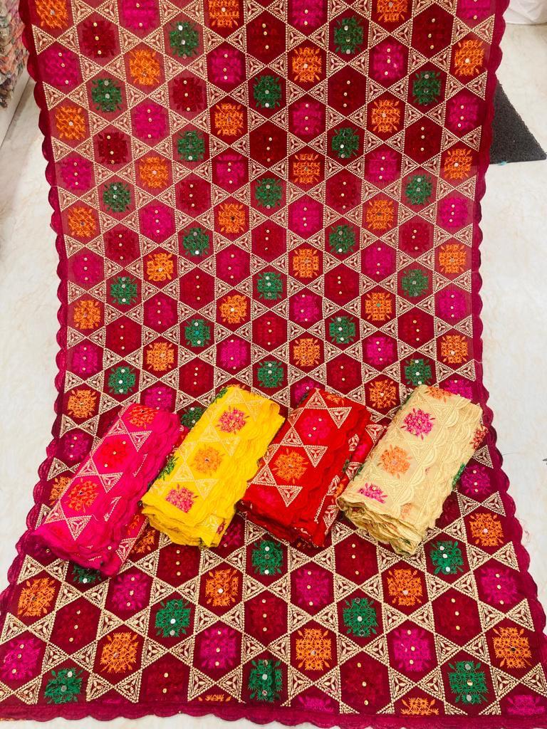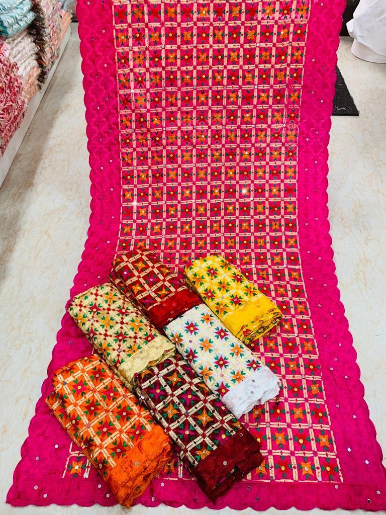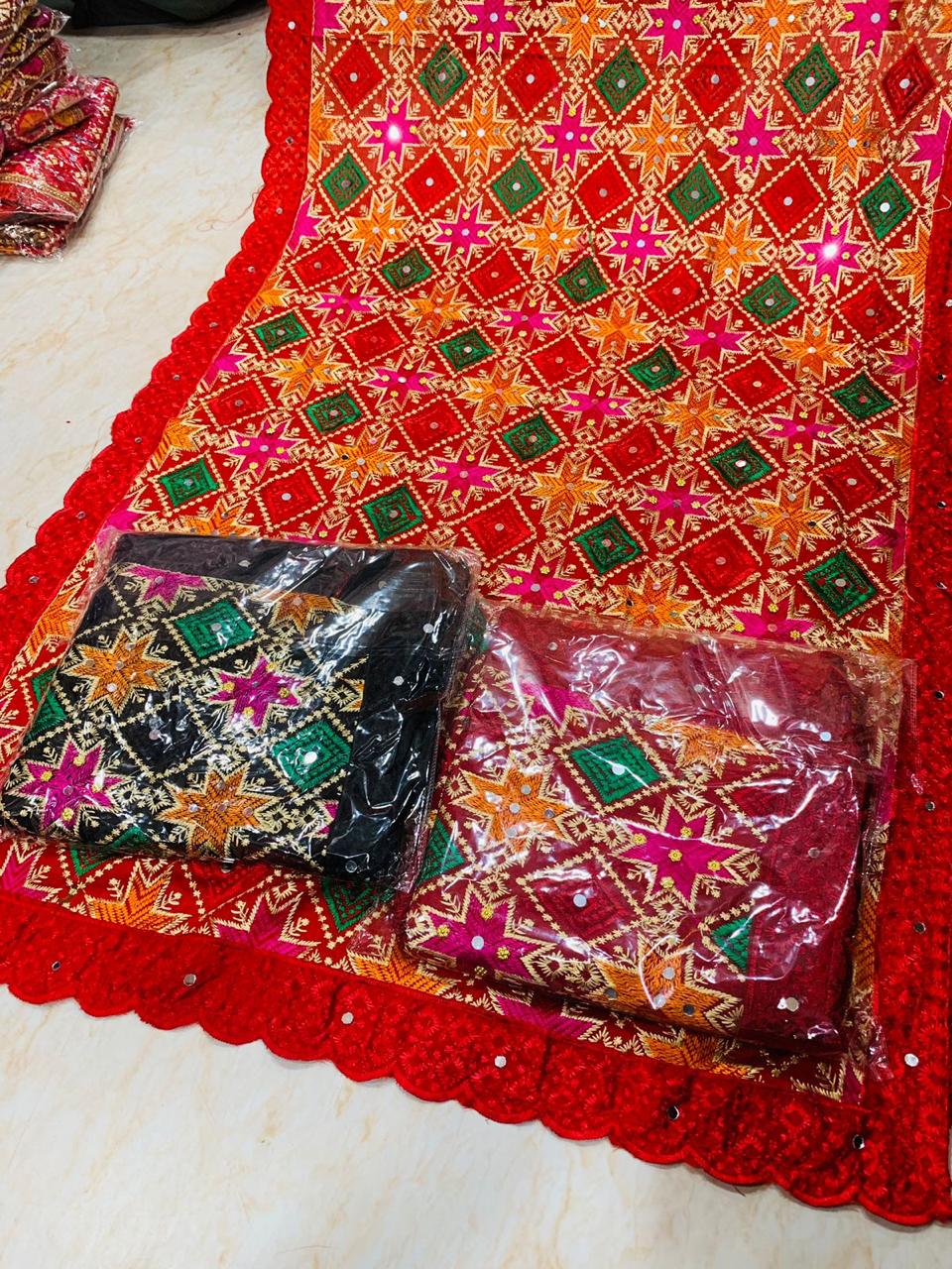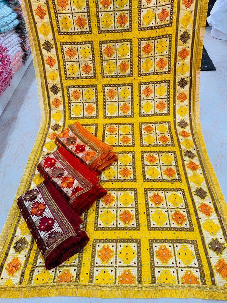 Phulkari, meaning “flower work” (phul= flower,kari=work) is a type of embroidery originally made throughout the Punjab.
